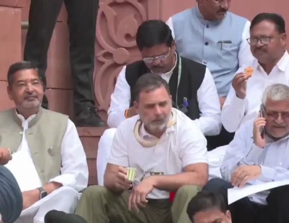 संसद परिसर में विरोध प्रदर्शन के दौरान चाय पीते राहुल गांधी का वीडियो सोशल मीडिया पर छाया