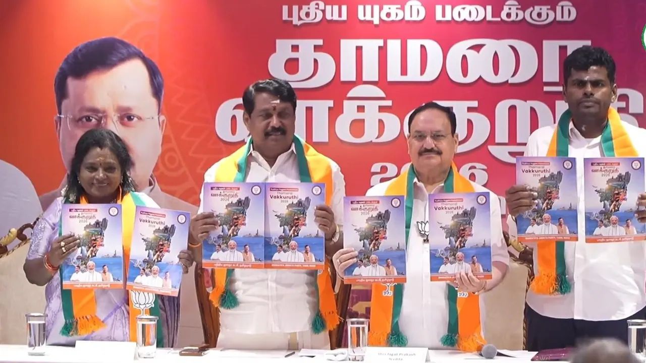 Tamil Nadu BJP Manifesto: बीजेपी का ‘संकल्प पत्र’ जारी, महिलाओं को ₹2000 मासिक और 3 मुफ्त सिलेंडर का वादा, महंगाई से राहत के लिए मिलेंगे ₹10,000